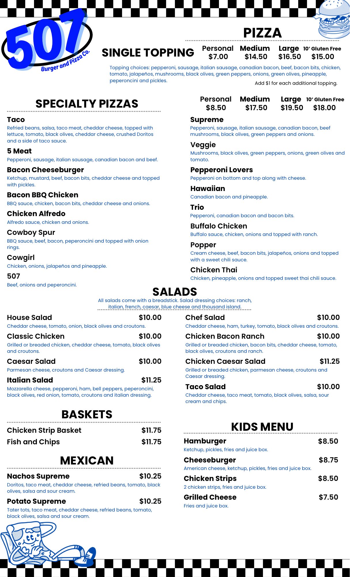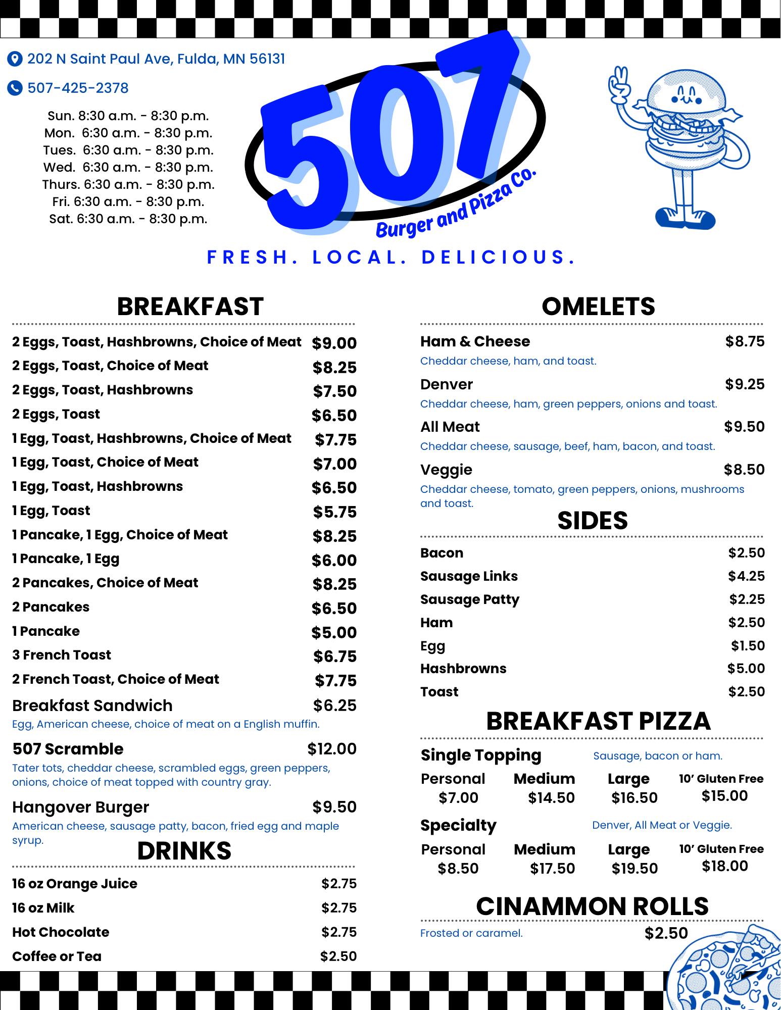 You know that moment when you can't decide what you're craving? 507 Burger & Pizza Co. at 202 N St Paul Ave, Fulda, MN, 56131 has you covered. Stacked specialty burgers, hot, cheesy pizza just the way you like it, sandwiches and wraps!! And don't forget Breakfast AND the daily specials - from burger baskets to pizza deals. Dine in, carry out, or grab it to go. 507 Burger & Pizza Co. in Fulda. Hours are: Sundays: 8:30am to 8:30pm, Mondays thru Saturday: 6:30am to 8:30pm
